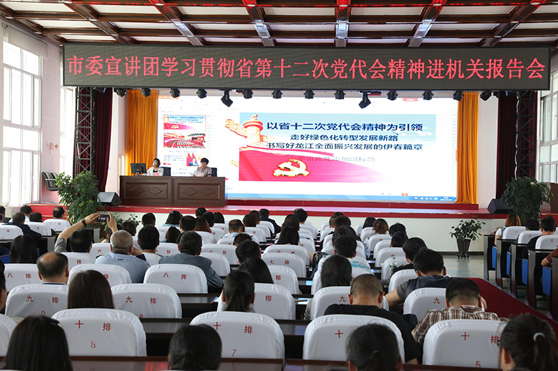 5月19日,市委宣讲团学习贯彻省十二次党代会精神进机关报告会在朗乡局举行,局党委理论学习中心组成员;局机关各部、委、办;行政各科室负责人;各基层单位负责同志、理论骨干总计200余人认真聆听了宣讲报告会。